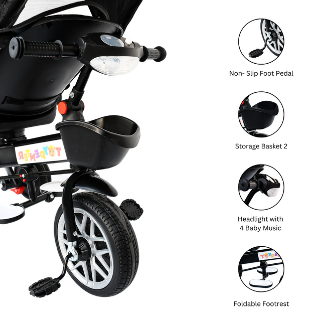 - Safety First: Equipped with a secure five-point safety harness and non-slip pedals, our tricycle prioritizes your child's safety at every turn. The secure harness, non-slip pedals, and sturdy construction prioritize your child's safety at every stage.