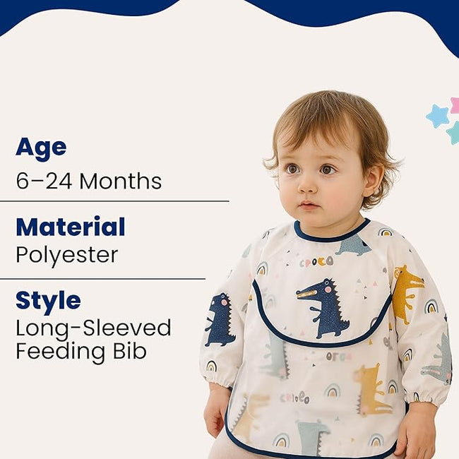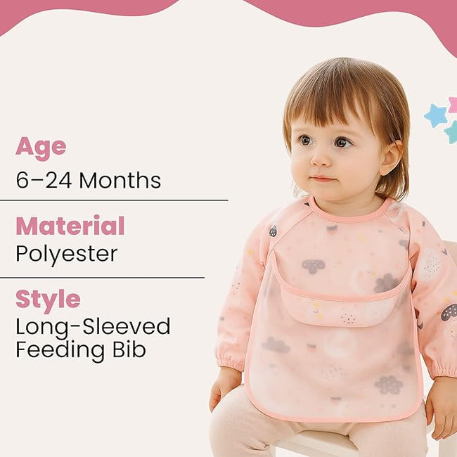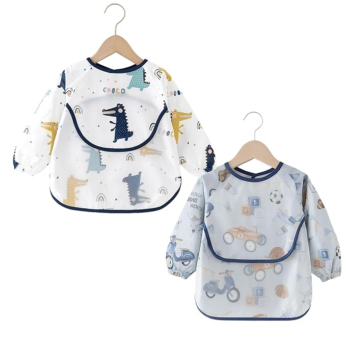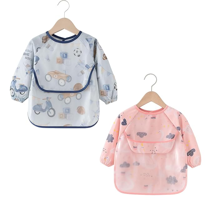 • LONG SLEEVES: Our baby long-sleeved bibs are designed to provide maximum coverage and protection for your child's clothing. The elasticized cuffs ensure a secure fit around your baby's wrists, preventing food or liquids from seeping onto the sleeves. Additionally, the long sleeves offer added protection, covering your child's arms and keeping their clothes clean and stain-free during mealtime or other messy activities.