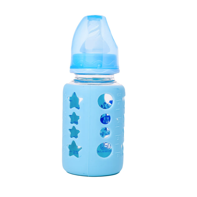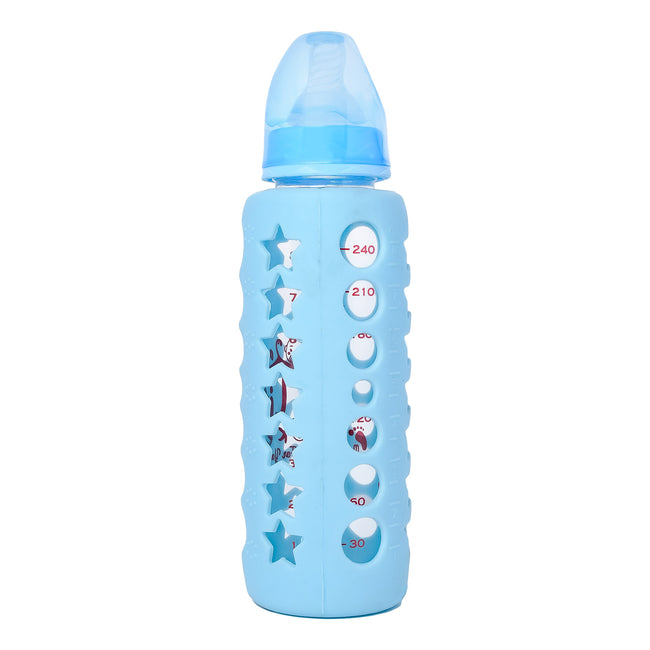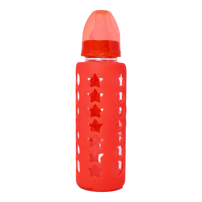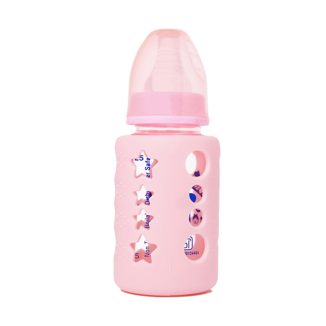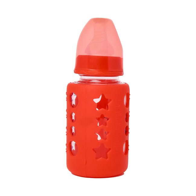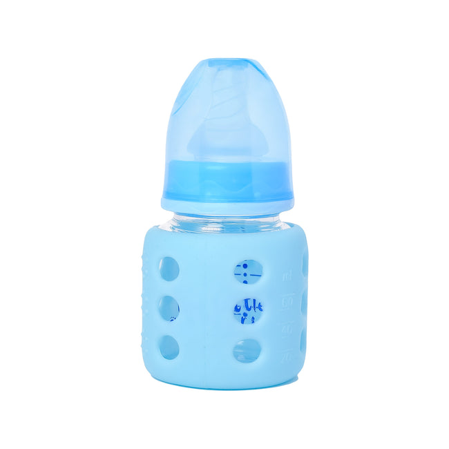 - Scratch resistant and light weight, glass feeding bottle with protective silicone sleeve and leak-proof flat cap, durable heat resistant, & removable silicone cover which protects from dust and scratches.