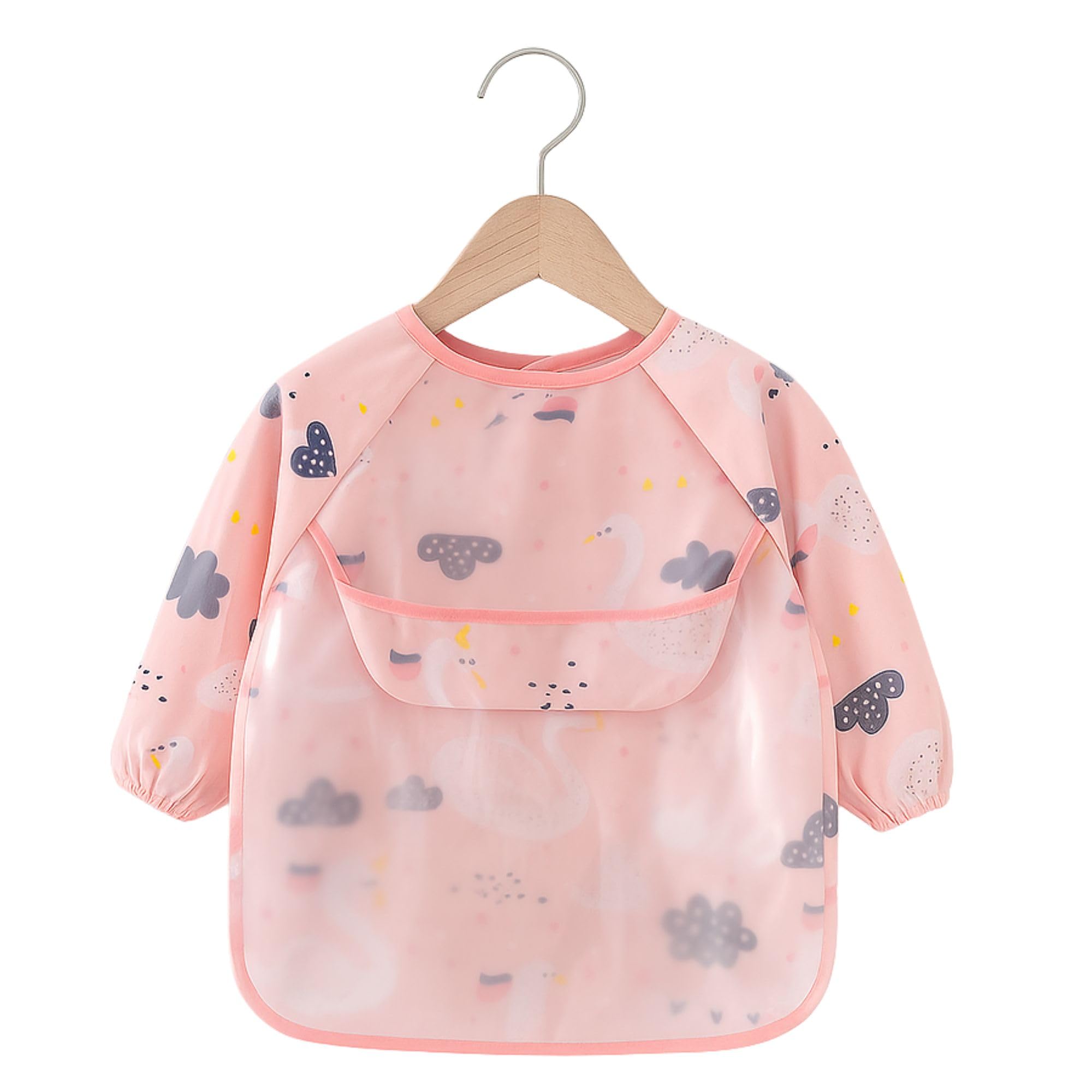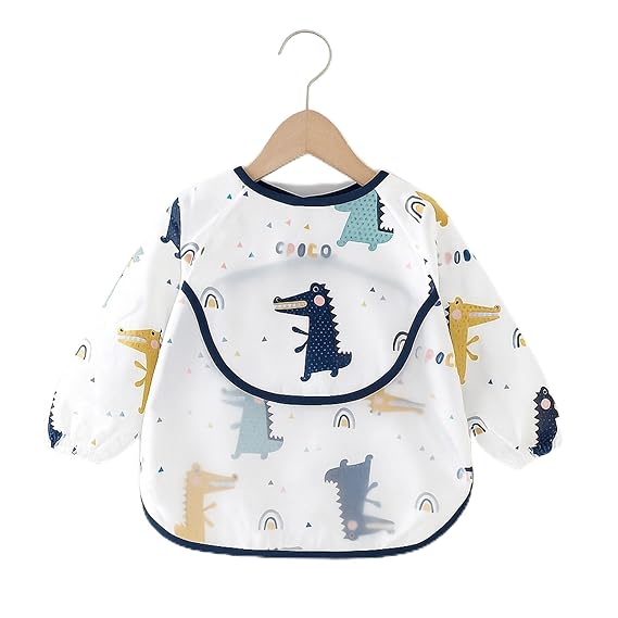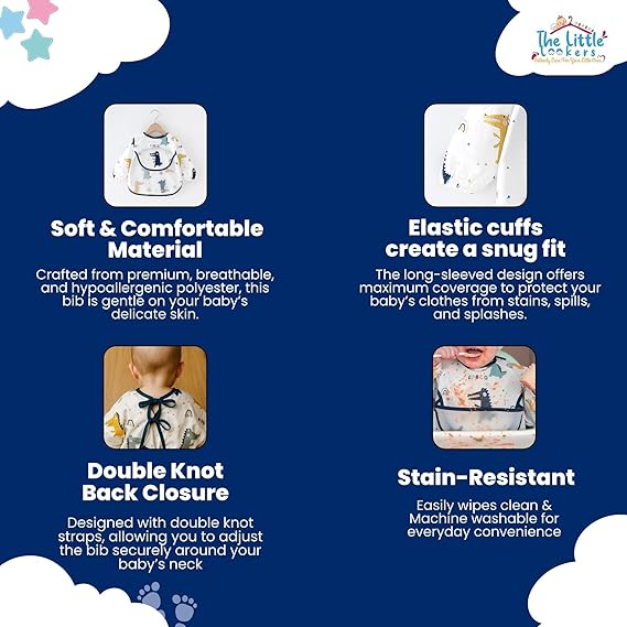 - LONG SLEEVES: Our baby long-sleeved bibs are designed to provide maximum coverage and protection for your child's clothing. The elasticized cuffs ensure a secure fit around your baby's wrists, preventing food or liquids from seeping onto the sleeves. Additionally, the long sleeves offer added protection, covering your child's arms and keeping their clothes clean and stain-free during mealtime or other messy activities.