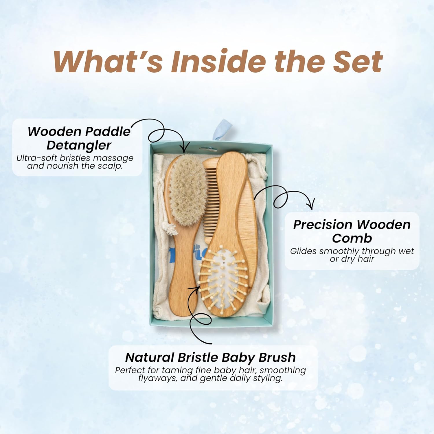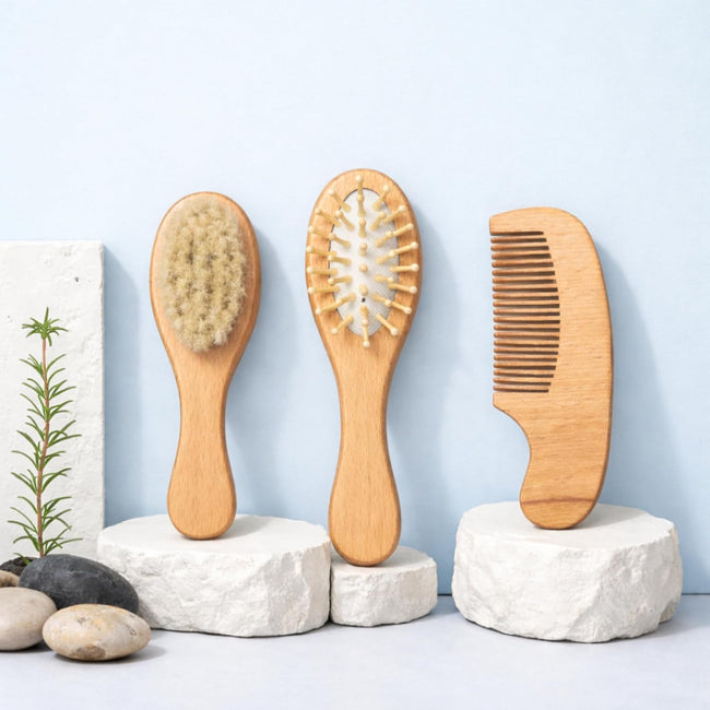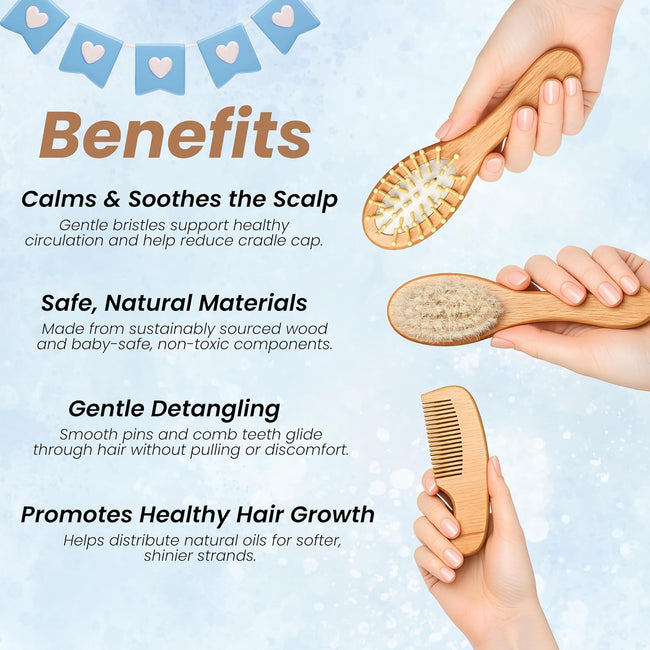 - ★ 【PERFECT BABY GIFT SET】 – This 3-in-1 wooden baby grooming kit includes a natural hair brush, massage brush, and wooden comb. A thoughtful and practical gift for newborns, baby showers, and toddlers, helping keep your baby’s hair neat and healthy.