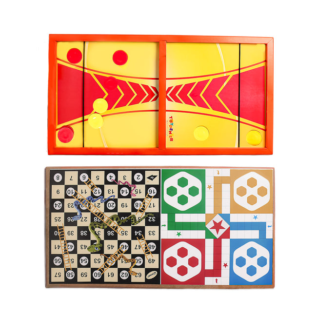 - 3 IN 1 Set: 3 in 1 String Hockey Game. Main board contains string Hockey and Backside showcases a Ludo and Snacks and ladder game.