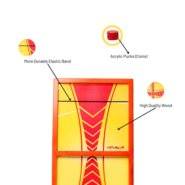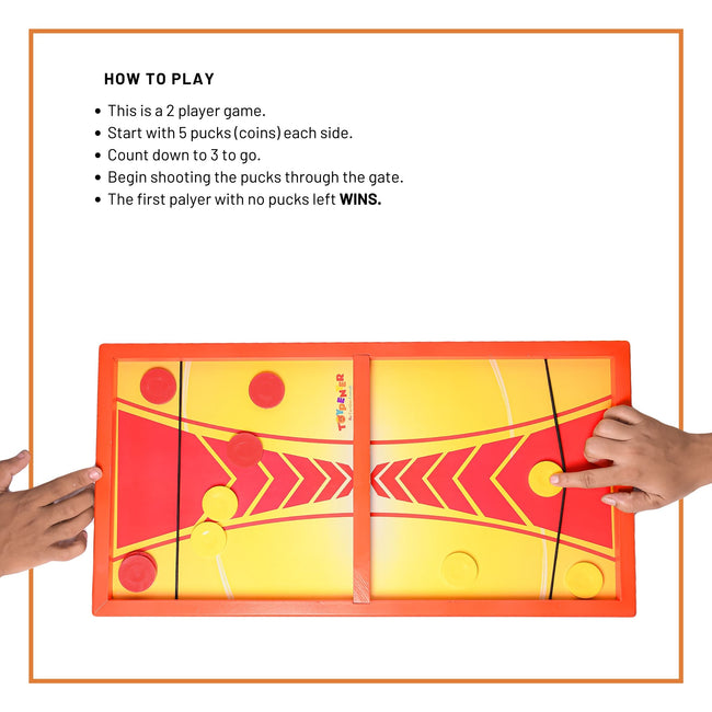 - MATERIAL: TOYPENTER Hockey sling puck game is made from High-quality of wooden material, sturdy, long-lasting material that is thick and firm. The two puck firing strings are made of strong and more durable elastic and the pucks (coins) are made from Acrylic material, outstanding strength, stiffness and safe for kids.